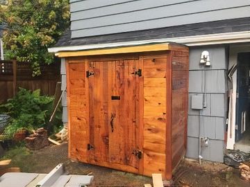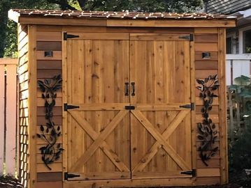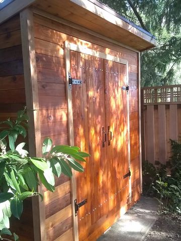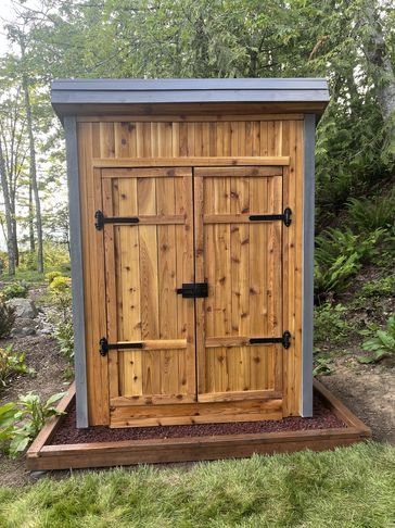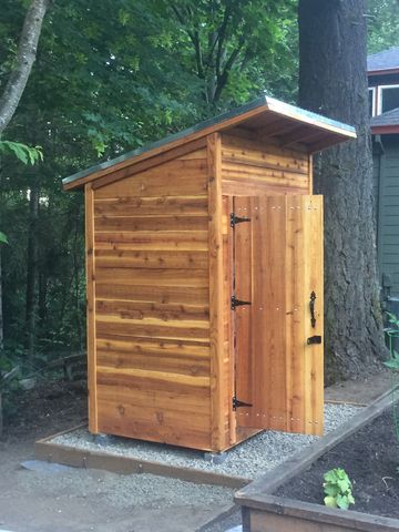 This outhouse style garden shed will fit almost anywhere! Made of 100% western red cedar , includes a built in hose reel on one side one shelf inside and can stand alone or sit against a fence . Come pick up today ! Or we can deliver to you for a nominal fee!